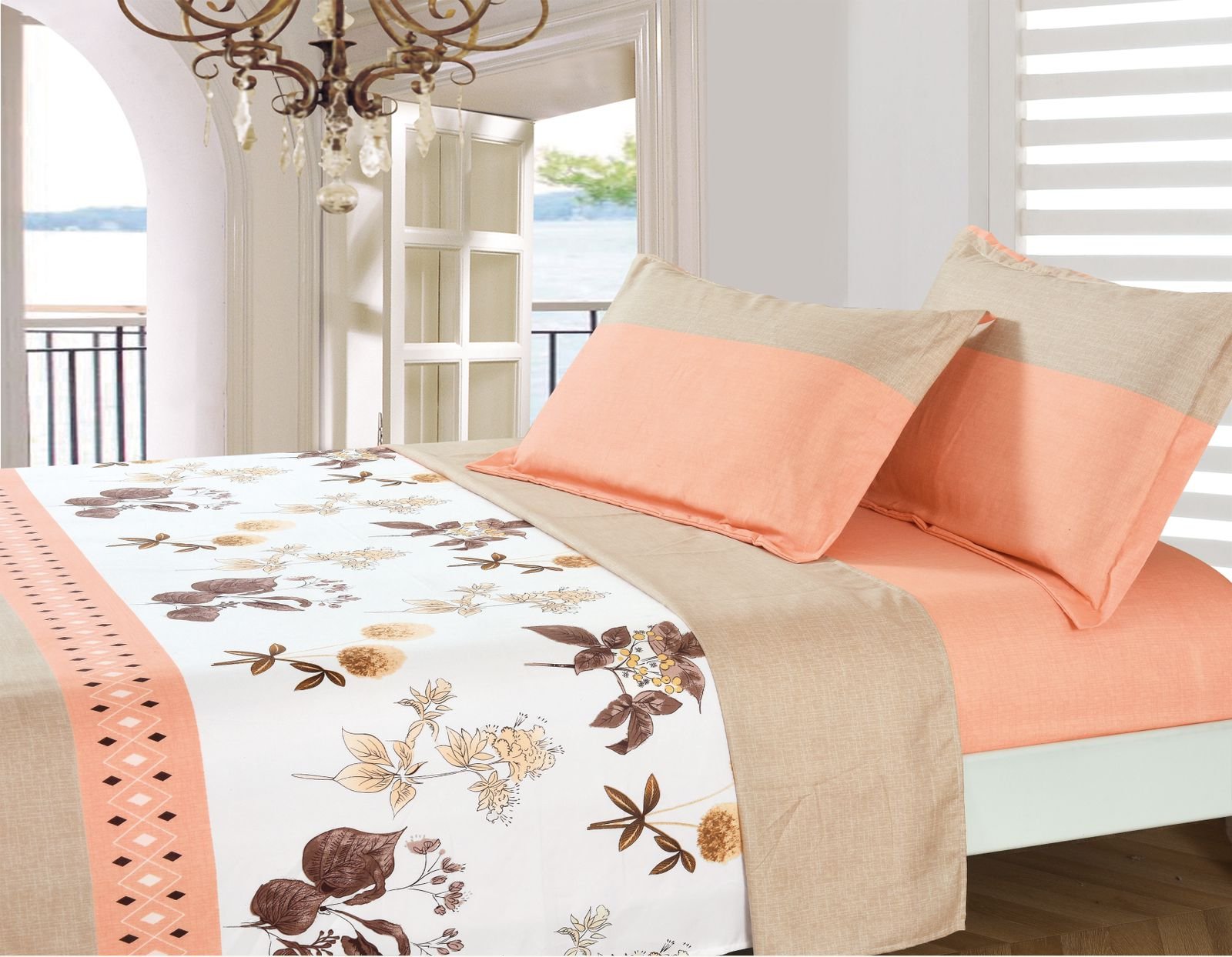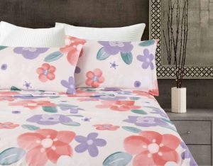 Juego de Sabanas estampadas color blanco con flores naranjas y moradas