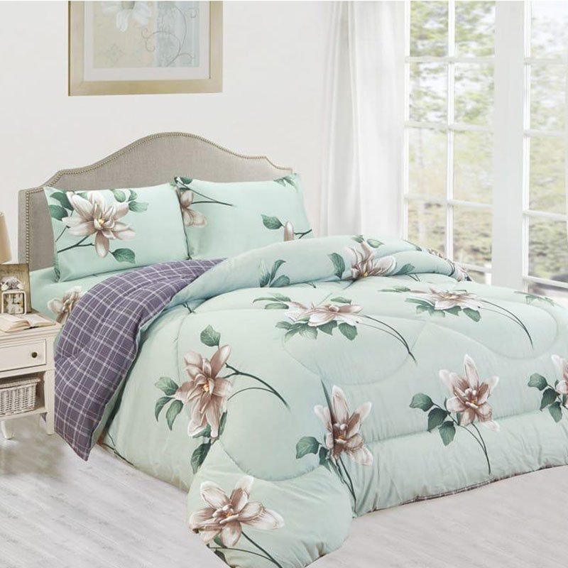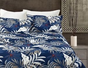 Juego de Sabanas estampadas color azul con hojas blancas