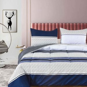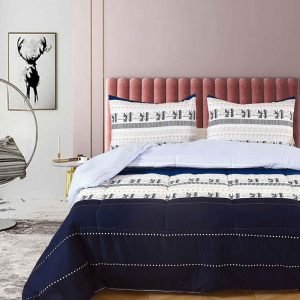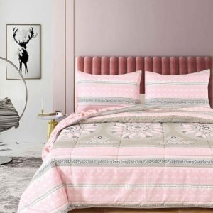 Edredón Queen estampado color rosado y gris con hojas blancas