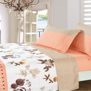 Juego de Sabanas estampadas color blanco con hojas y flores naranjas