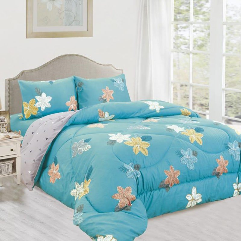 Edredón acolchado King 1200 hilos color celeste con hojas lilas y verdes