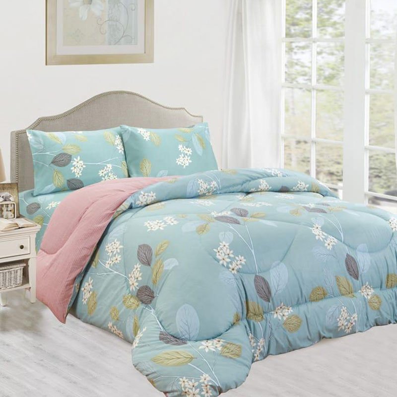 Edredón acolchado King 1200 hilos color celeste con hojas lilas y verdes